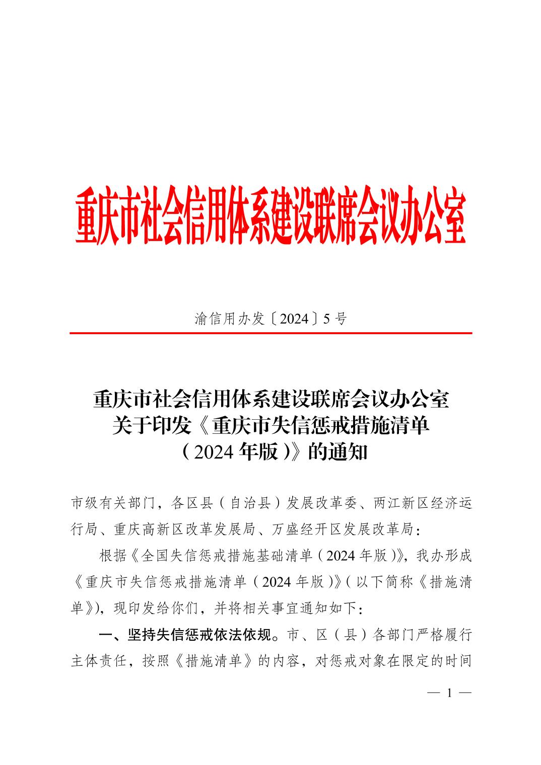 重慶市社會信用體系建設聯席會議辦公室關于印發《重慶市失信懲戒措施清單 (2024 年版) 》的通知