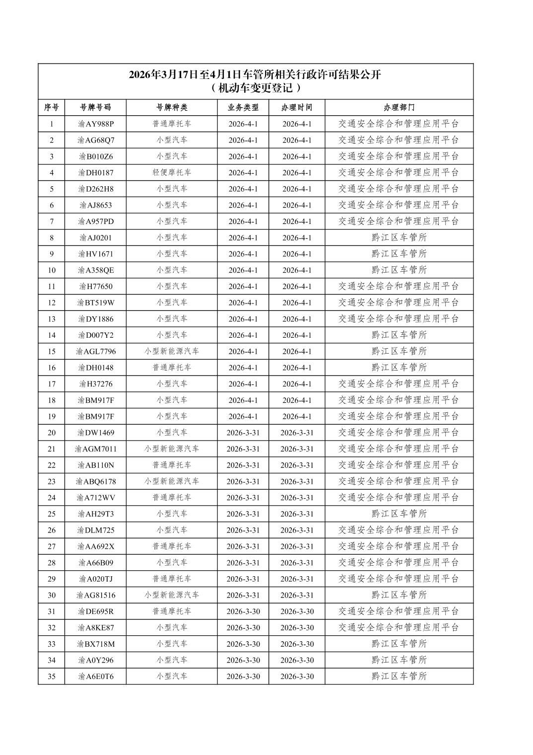 2026年3月17日至4月1日車管所相關(guān)行政許可結(jié)果公開(機動車變更登記)">