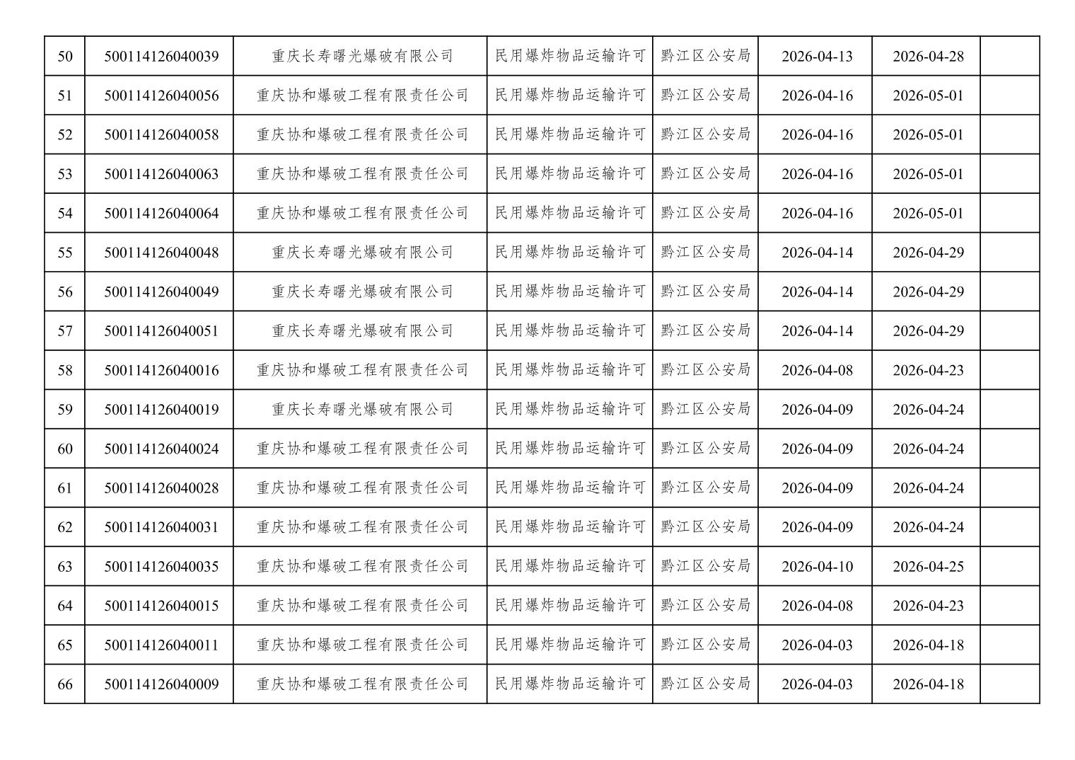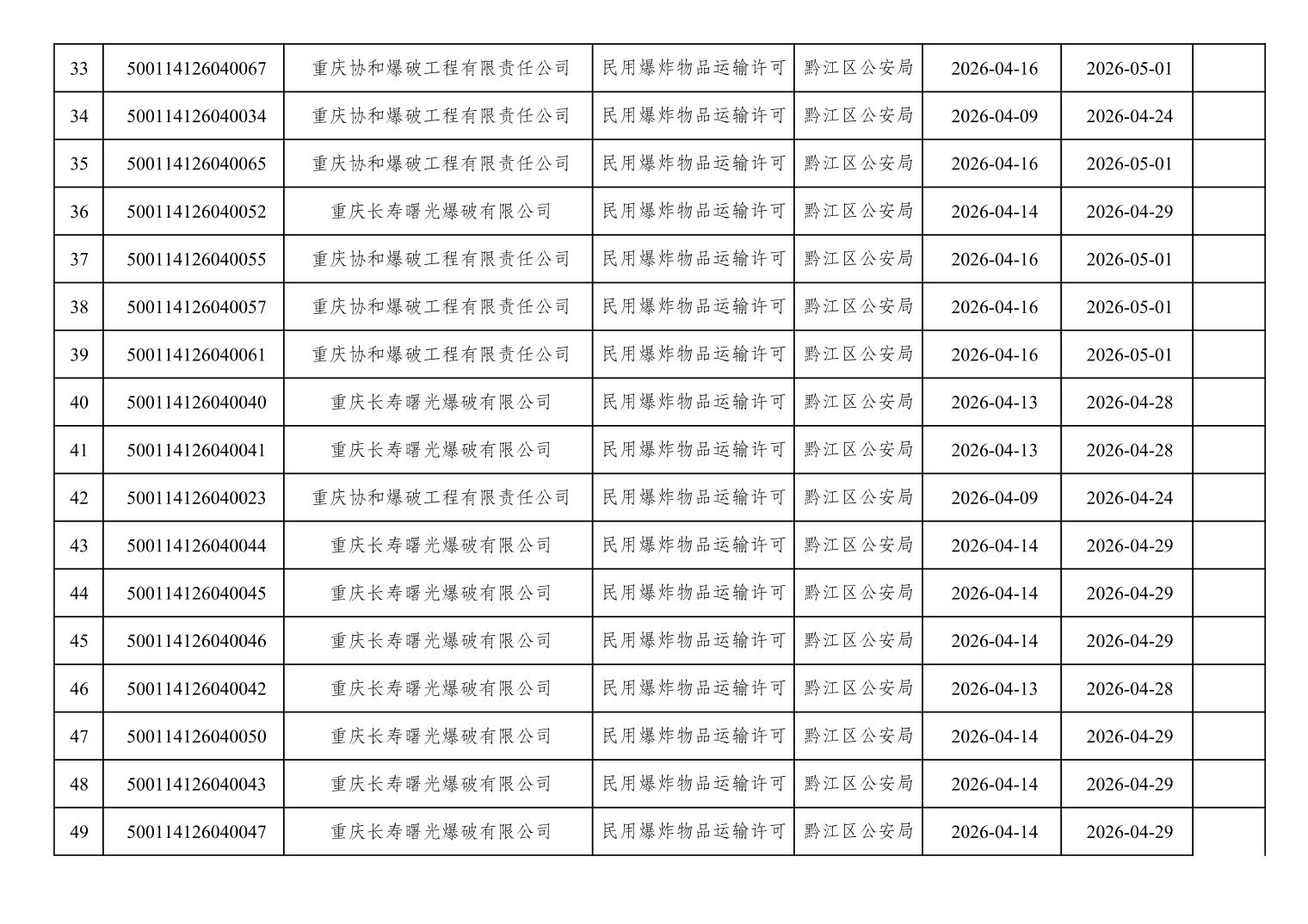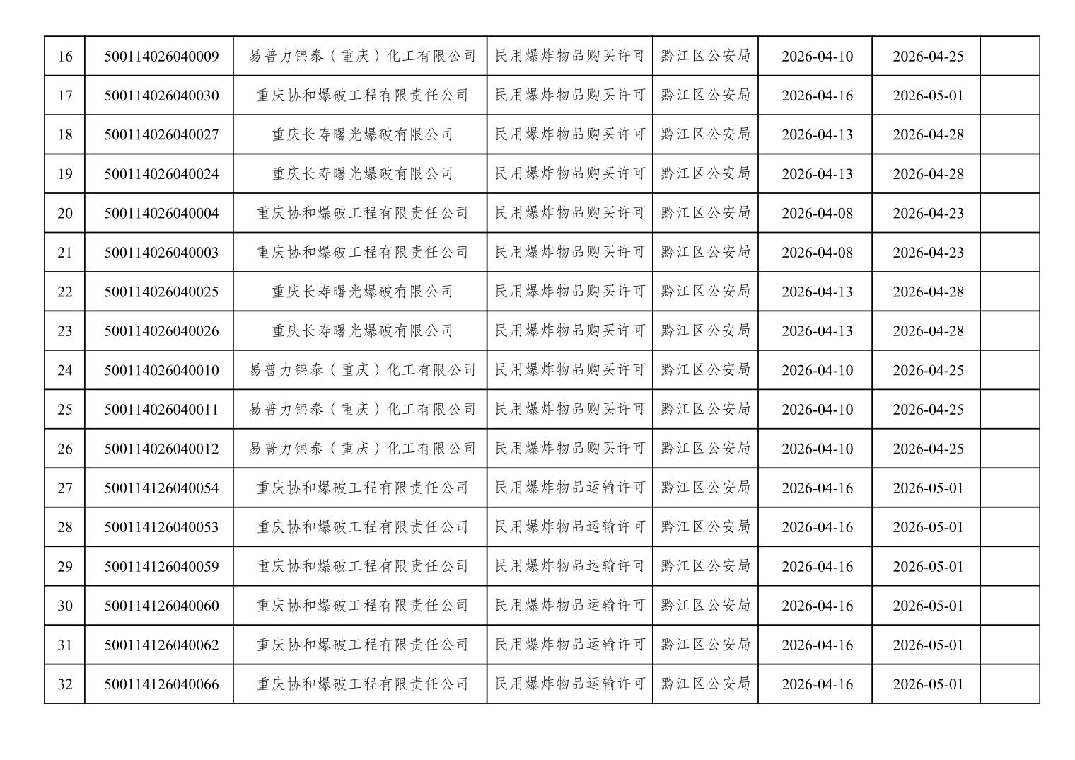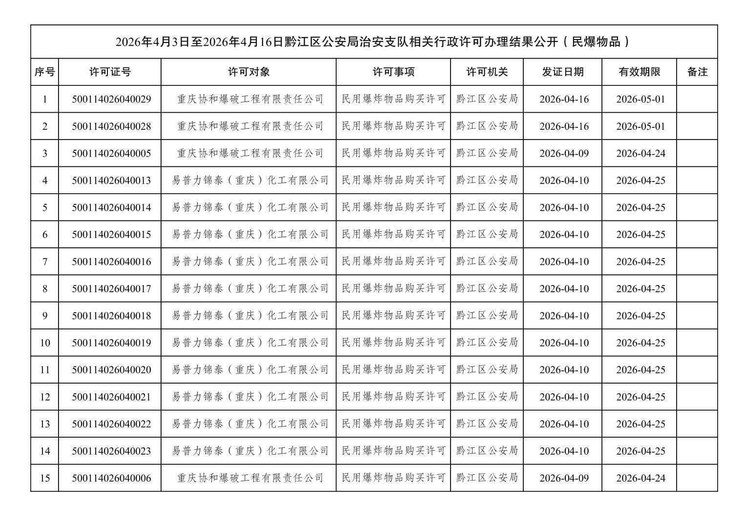 2026年4月3日至2026年4月16日黔江區公安局治安支隊相關行政許可辦理結果公開(民爆物品)">