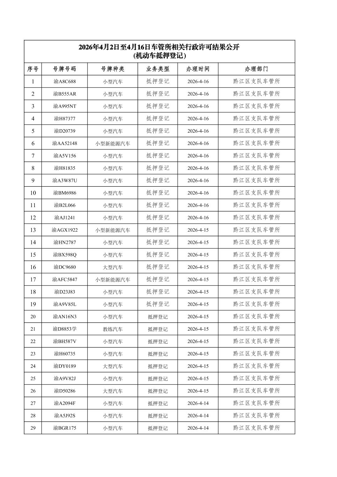 2026年4月2日至4月16日車管所相關(guān)行政許可結(jié)果公開(機動車抵押登記)">