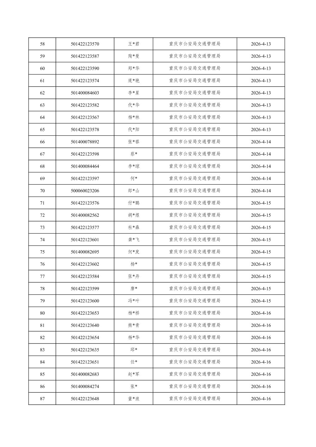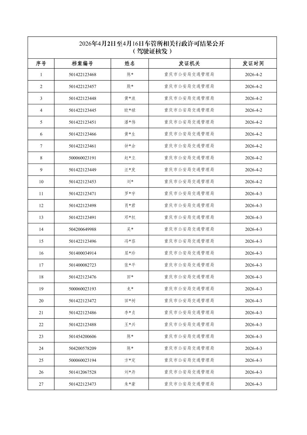 2026年4月2日至4月16日車管所相關(guān)行政許可結(jié)果公開(駕駛證核發(fā))