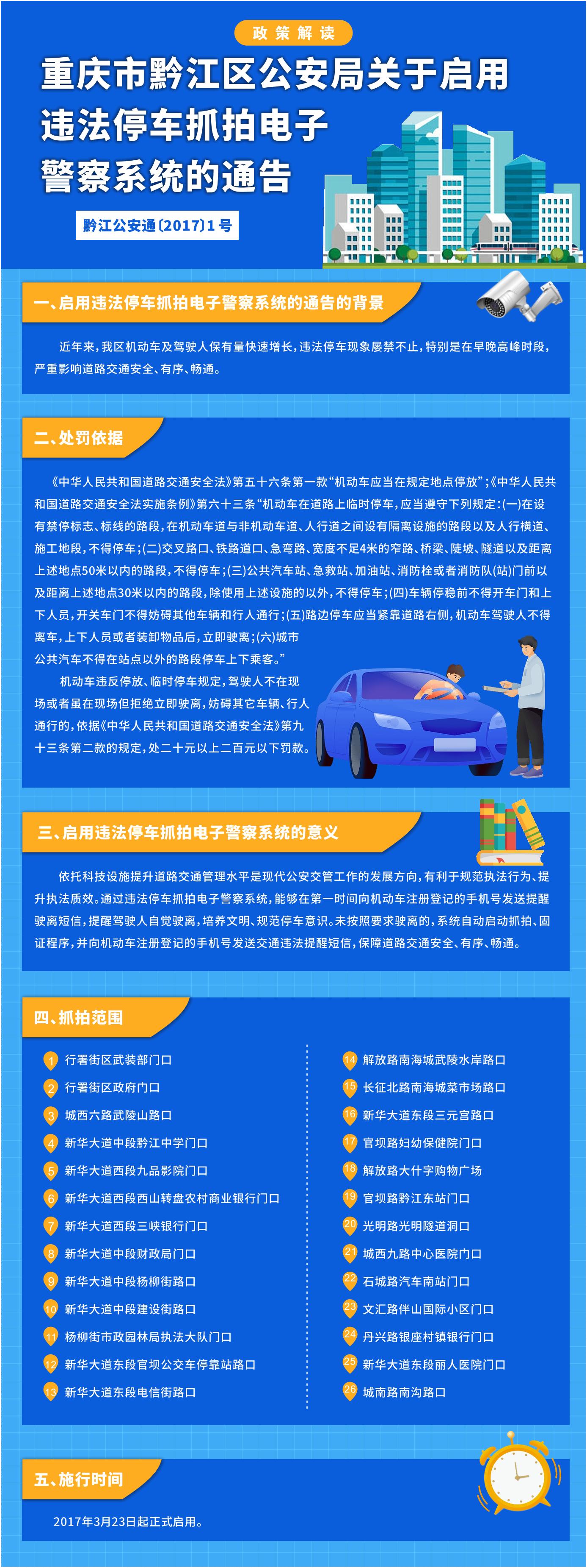 《重慶市黔江區公安局關于啟用違法停車抓拍電子警察系統的通告》政策解讀