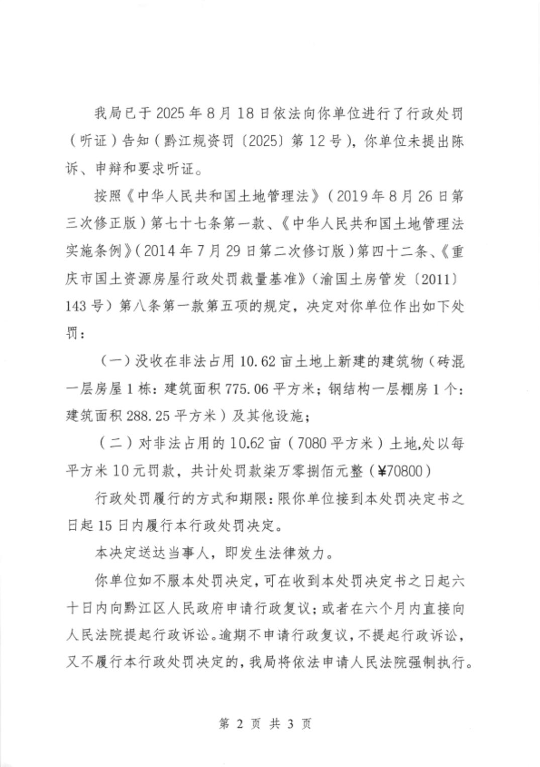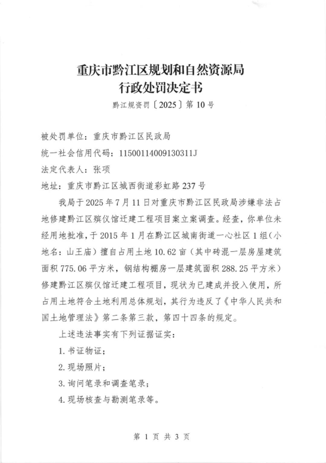 重慶市黔江區規劃和自然資源局行政處罰決定書(黔江規資罰〔2025〕第10號)">