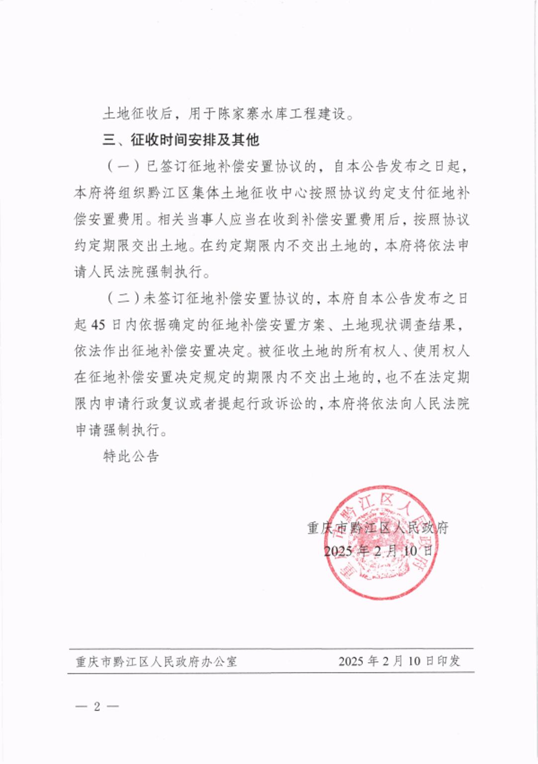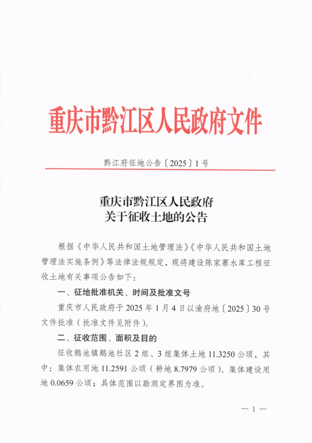 關于征收土地的公告(陳家寨水庫)(黔江府征地公告〔2025〕1號)">