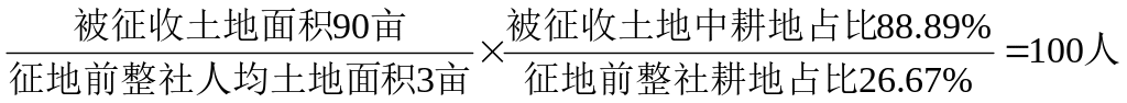 土地中耕地占比再除以農村集體經濟組織耕地占比。以乙社為例,因林地、未利用地占比較大等原因,征地前該社土地總面積為300畝(耕地為80畝),耕地占比為26.67%,集體經濟組織總人口為100人,人均土地為3畝;假設本次征收土地總面積為90畝(耕地為80畝),征收土地中耕地占比為88.89%。因被征收土地中耕地占比(88.89%)大于征地前整社耕地占比(26.67%),則該社本次征地人員安置對象的人數為100人(即)。