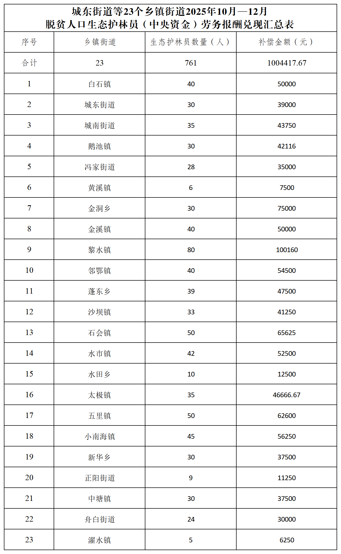 附件: 1.城東街道等23個鄉(xiāng)鎮(zhèn)街道2025年10月—12月脫貧人口生態(tài)護(hù)林員(中央資金)勞務(wù)報酬兌現(xiàn)匯總表