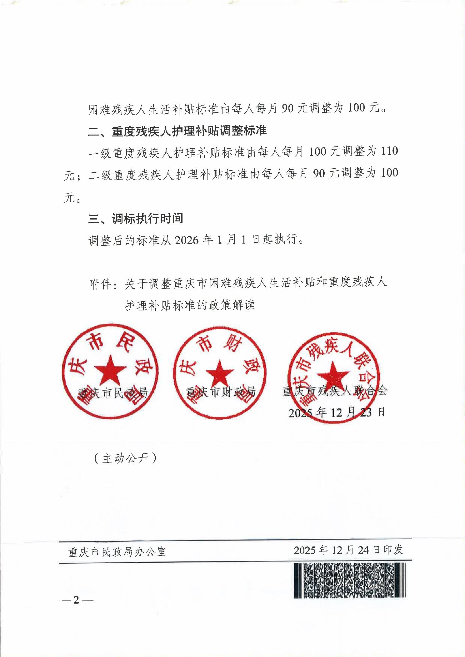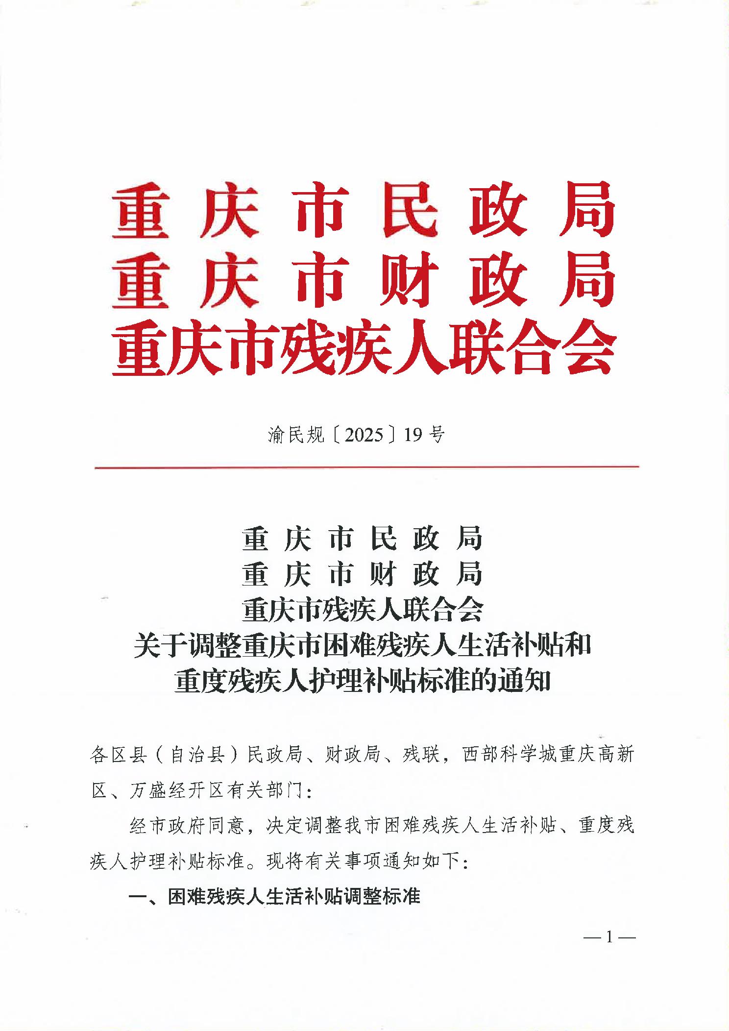 重慶市民政局、重慶市財政局、重慶市殘疾人聯合會關于調整重慶市殘疾人兩項補貼標準的通知