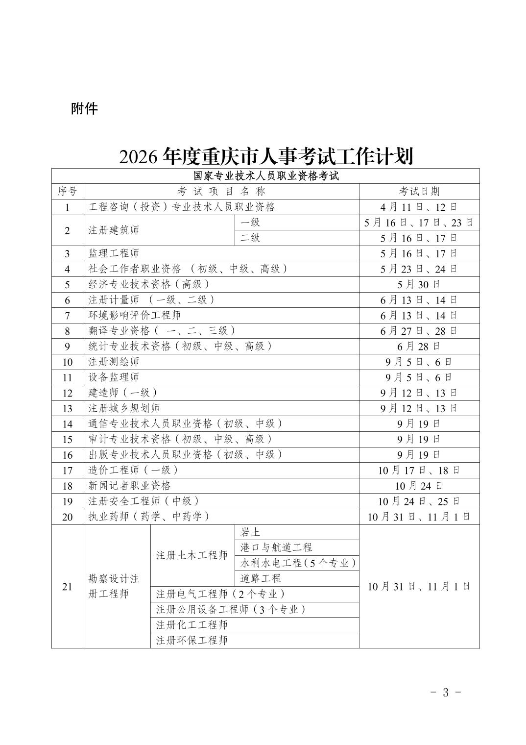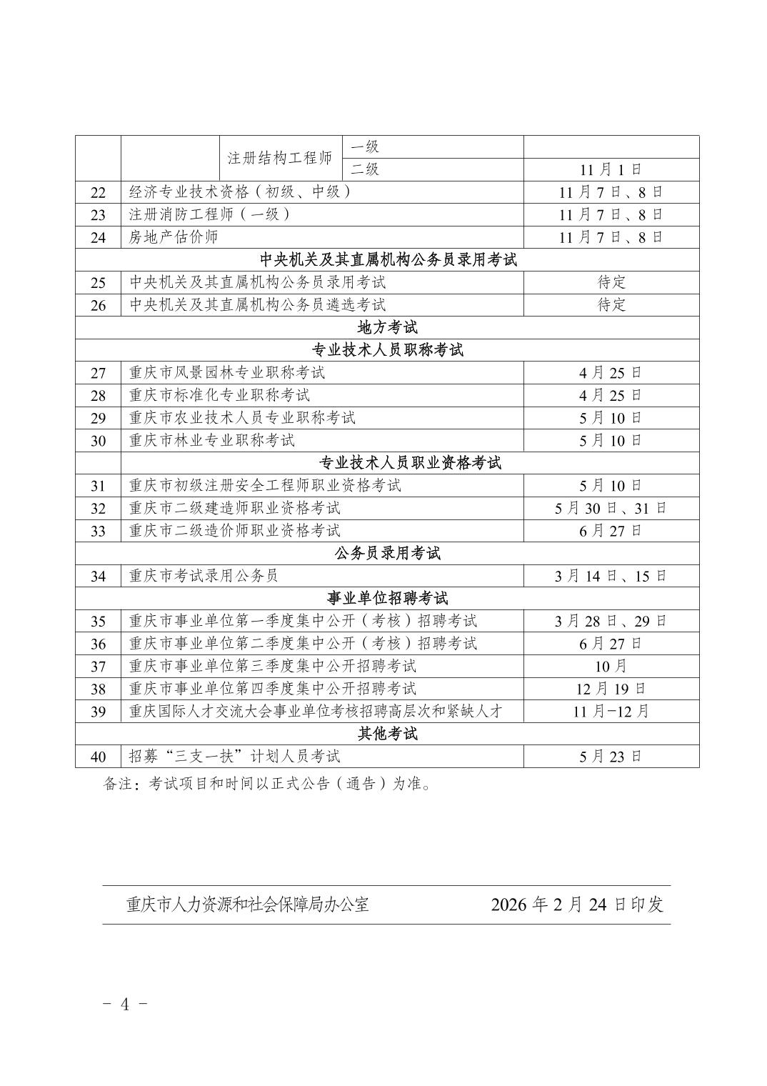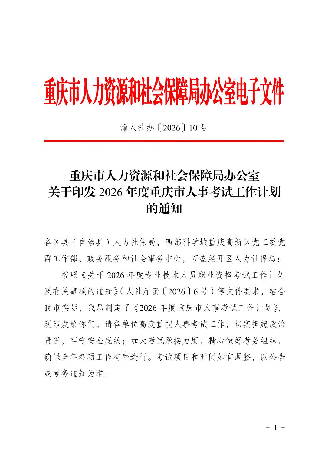 重慶市人力資源和社會保障局辦公室關于印發2026年度人事考試工作計劃的通知