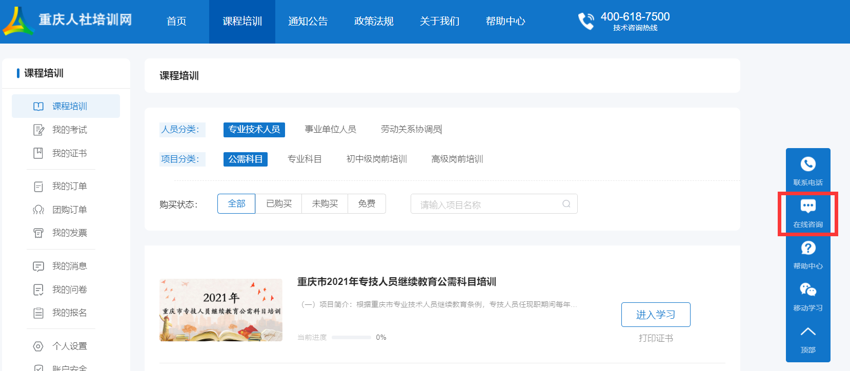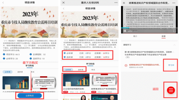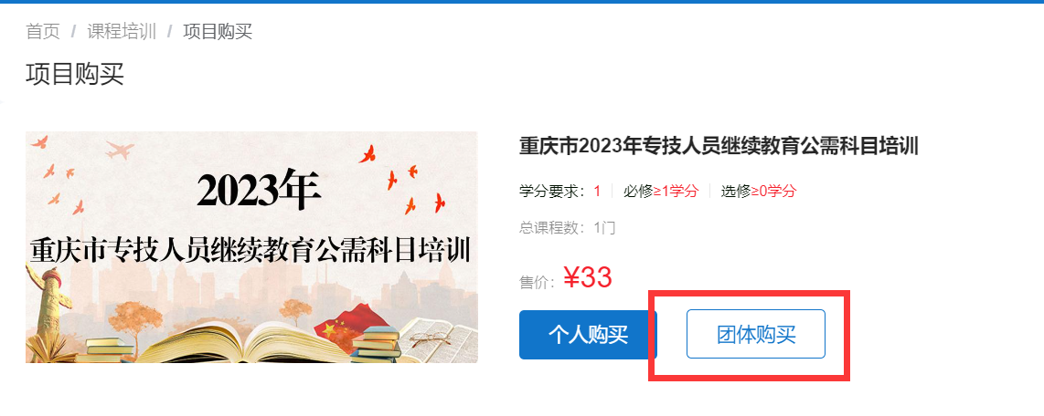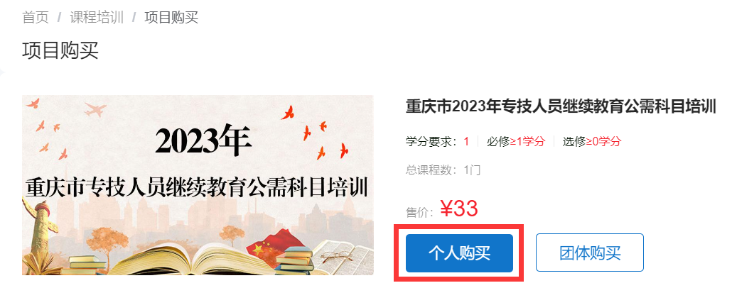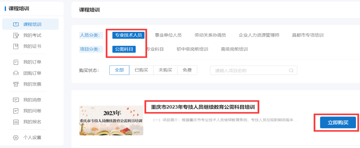 登錄后在首頁(yè)“在線學(xué)習(xí)中心”選擇“公需科目”進(jìn)入網(wǎng)絡(luò)學(xué)習(xí)平臺(tái),選擇“重慶市2023年專技人員繼續(xù)教育公需科目培訓(xùn)”培訓(xùn)項(xiàng)目,點(diǎn)擊“立即購(gòu)買”按鈕,進(jìn)入項(xiàng)目購(gòu)買頁(yè)面。