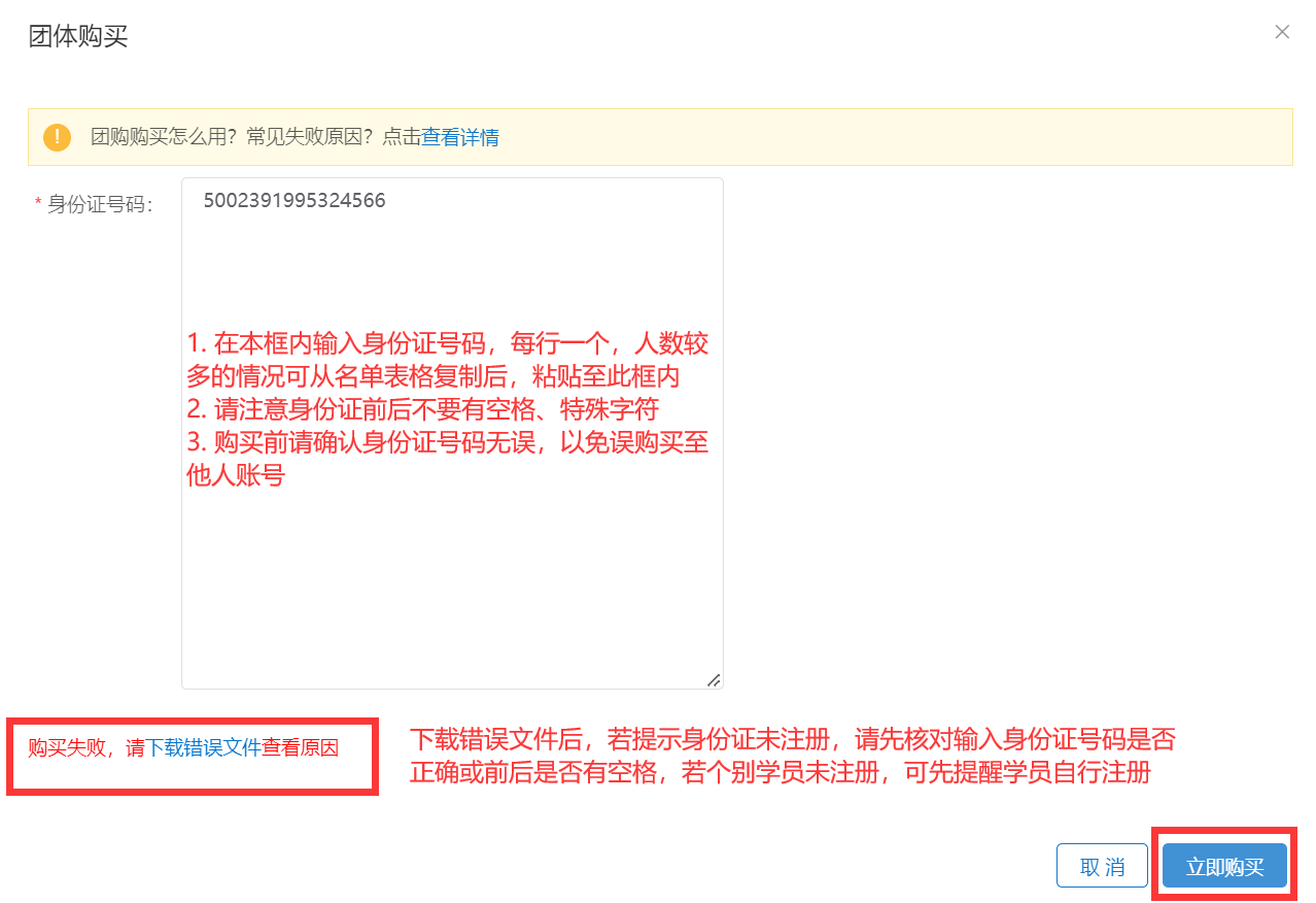 2.統(tǒng)一繳費(fèi)。指定單位專人用個(gè)人賬號(hào)登錄學(xué)習(xí)平臺(tái),在項(xiàng)目購(gòu)買頁(yè)面,選擇“團(tuán)體購(gòu)買”,輸入需參訓(xùn)學(xué)員的身份證號(hào)碼,輸入完成后點(diǎn)擊“立即購(gòu)買”,等待系統(tǒng)驗(yàn)證,若學(xué)員賬號(hào)存在且未購(gòu)買對(duì)應(yīng)學(xué)習(xí)計(jì)劃,即可提交訂單;購(gòu)買成功,學(xué)員即可登錄進(jìn)行學(xué)習(xí)。如購(gòu)買失敗,可在頁(yè)面左下角點(diǎn)擊“下載錯(cuò)誤文件”,查看原因后進(jìn)行修改并重新提交訂單。