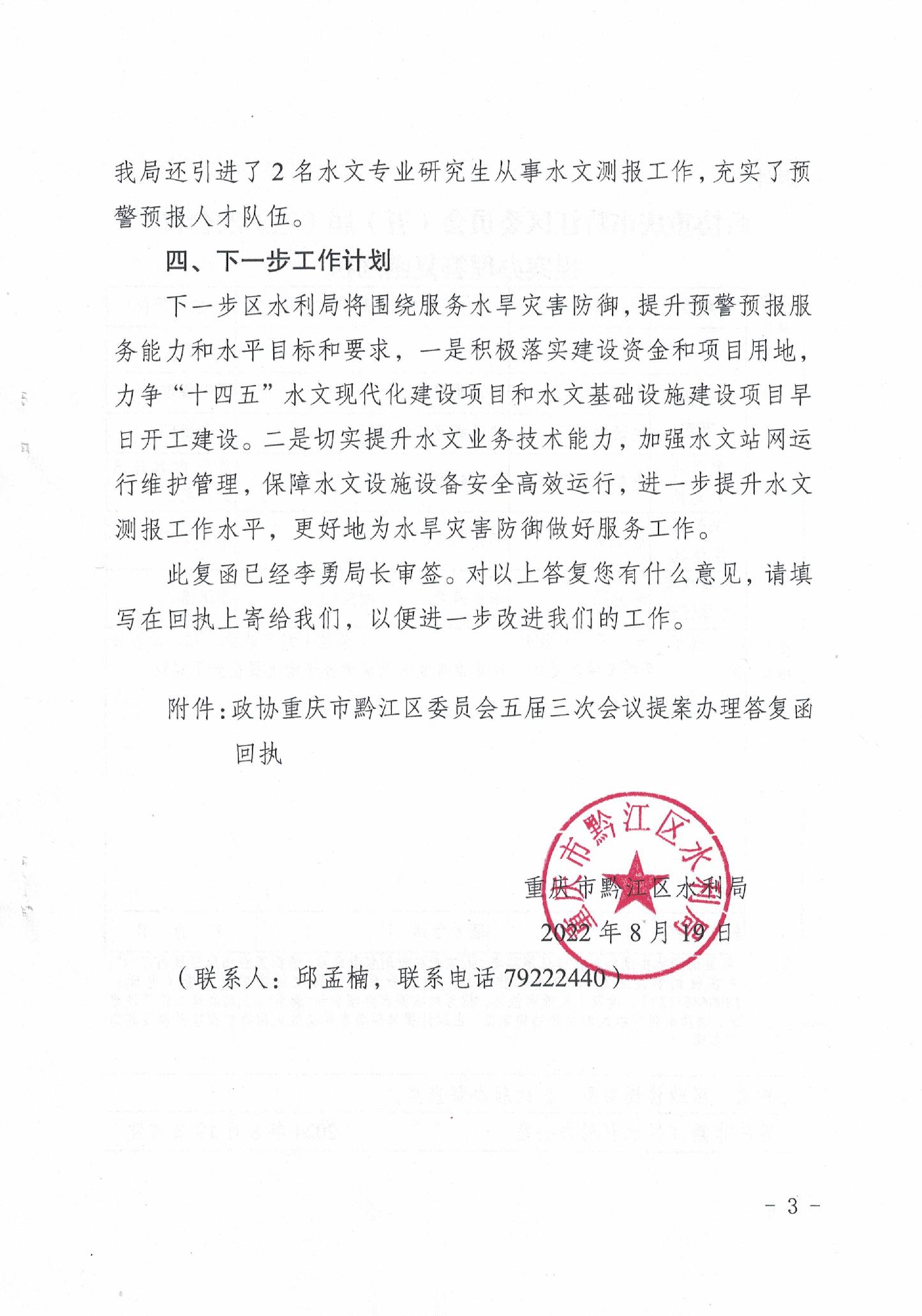 重慶市黔江區(qū)水利局關(guān)于政協(xié)五屆三次會(huì)議第313號(hào)提案的答復(fù)函