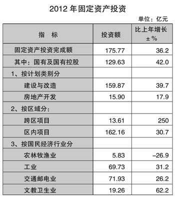 2012年,全區(qū)固定資產(chǎn)投資完成175.77億元,比上年增長36.2%,投資對經(jīng)濟(jì)增長的貢獻(xiàn)率為62%,拉動經(jīng)濟(jì)增長8.6個百分點,其中國有投資實現(xiàn)129.63億元,占投資總量的73.7%,是投資增長的主導(dǎo)力量。全年建設(shè)與改造投資完成159.87億元,增長39.7%,占投資總量的90.9%;房地產(chǎn)開發(fā)投資完成15.90億元,增長17.9%。國民經(jīng)濟(jì)各行業(yè)中,農(nóng)林牧漁業(yè)完成投資5.83億元,下降26.9%;工業(yè)完成投資69.73億元,增長31.2%;教育衛(wèi)生文化事業(yè)完成投資19.26億元,增長62.2%。