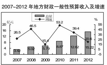 2012年,全區(qū)實現(xiàn)財政總收入54.49億元,比上年增長22.4%。實現(xiàn)地方財政收入28.11億元,增長23.0%,一般性預(yù)算收入15.22億元,增長20.6%,實現(xiàn)稅收收入10.23億元,其中增值稅和營業(yè)稅分別增長17.4%和17.7%。全年地方財政支出54.87億元,比上年增長15.8%,其中農(nóng)林水事務(wù)支出增長25.1%,教育支出增長67.0%,醫(yī)療衛(wèi)生支出增長21.2%,社會保障和就業(yè)支出增長4.41%,城鄉(xiāng)社區(qū)事務(wù)支出增長5.6%。