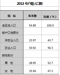 截止2013年末,全區戶籍總人口54.89萬人,比上年增加0.38萬人,其中非農業人口23.97萬人、農業人口30.92萬人,戶籍人口自然增長率為3.69‰。2013年末,全區常住人口45.31萬人,城鎮化率43.79%。