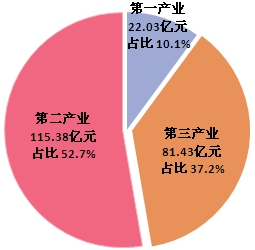按產業分,第一產業增加值22.03億元,增長5.3%;第二產業增加值115.38億元,增長10.2%;第三產業增加值81.43億元,增長10.9%。