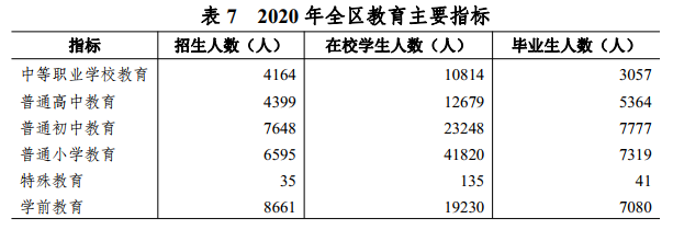 全區共有普通高等教育學校2所,中等職業學校2所,普通中學26所,普通小學61所,幼兒園151所,特殊教育學校1所。高中階段教育毛入學率98.6%,初中入學率100.0%,小學入學率100.0%,學前教育三年毛入園率90.2%。學前教育普惠率95.6%。九年義務教育鞏固率100.0%。