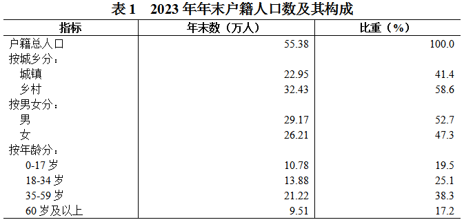 年末戶籍人口55.38萬人,其中,城鎮人口22.95萬人,鄉村人口32.43萬人。