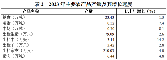油料產量2.31萬噸,增長10.0%。烤煙產量0.46萬噸,增長8.3%。水果產量7.98萬噸,增長7.0%。豬肉產量6.44萬噸,增長4.8%。生豬出欄79.09萬頭,增長2.6%。年末生豬存欄47.35萬頭,增長3.9%。牛出欄3.14萬頭,增長14.2%。