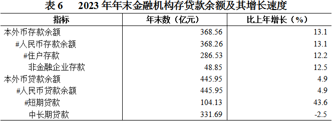年末全區金融機構本外幣存貸款余額814.51億元,比上年增長8.6%,其中,存款余額368.56億元,增長13.1%,存款余額中,住戶存款余額286.66億元,增長12.2%;貸款余額445.95億元,增長4.9%,貸款余額中,短期貸款104.13億元,增長43.6%;中長期貸款331.69億元,下降2.5%。