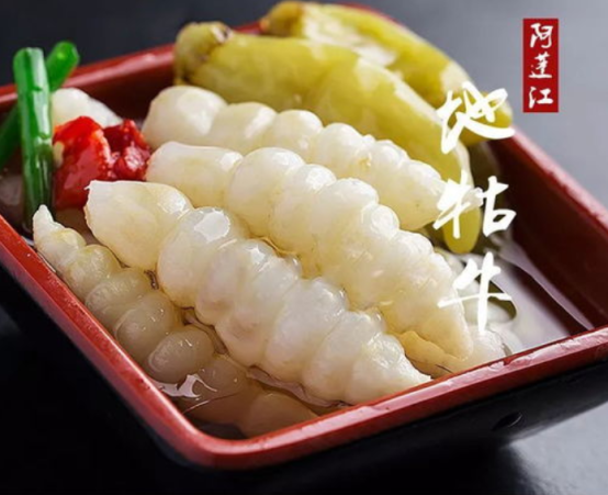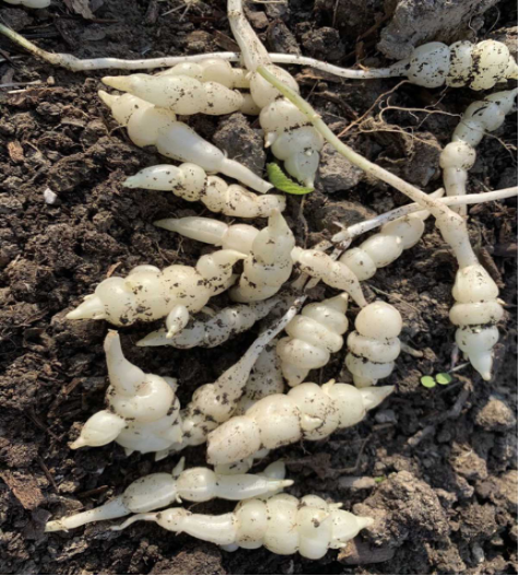 黔江地牯牛塊莖外形短節(jié)狀、一般5-7節(jié),兩頭略尖、呈紡錘形、似蠶體,根莖白嫩、晶瑩剔透,塊莖致密多汁、質堅脆、易折斷。每100克含蛋白質≥2.2g、脂肪≥0.3g、胡蘿卜素≥13.7μg。