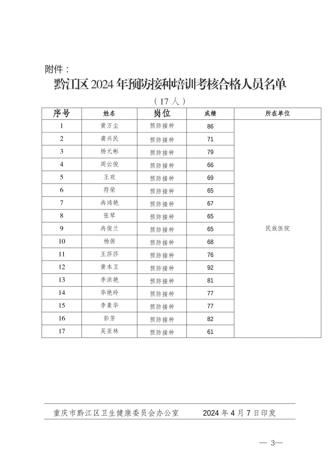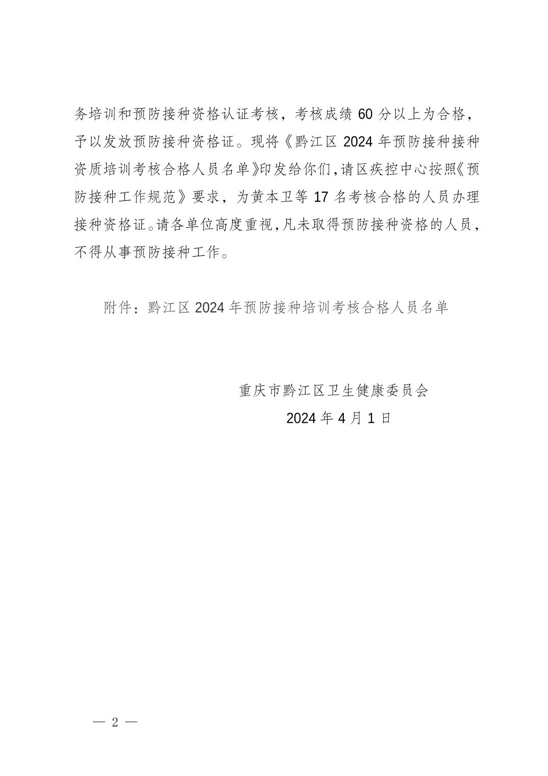 重慶市黔江區(qū)衛(wèi)生健康委員會關(guān)于黃本衛(wèi)等17名預(yù)防接種人員接種資質(zhì)認定的通知