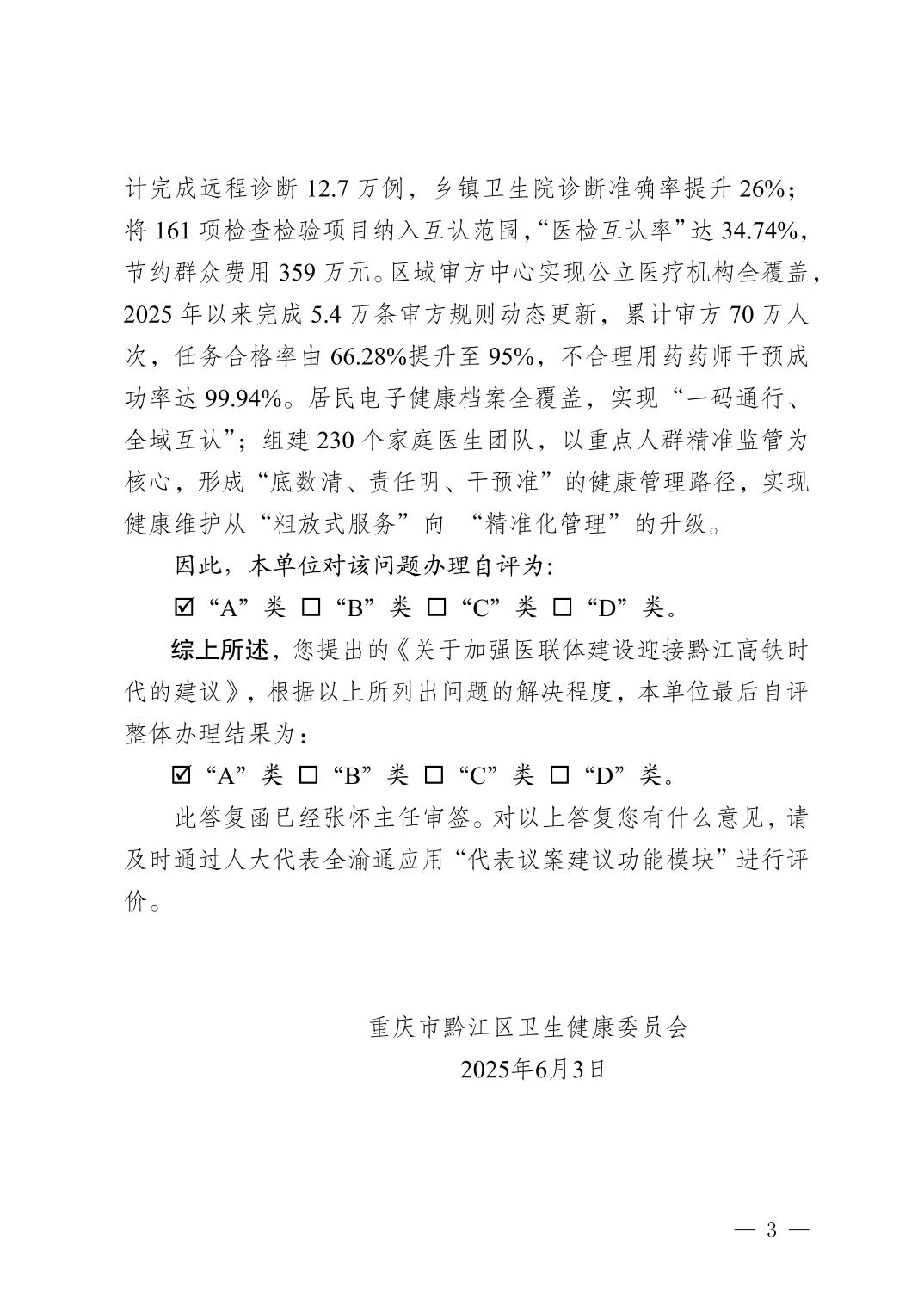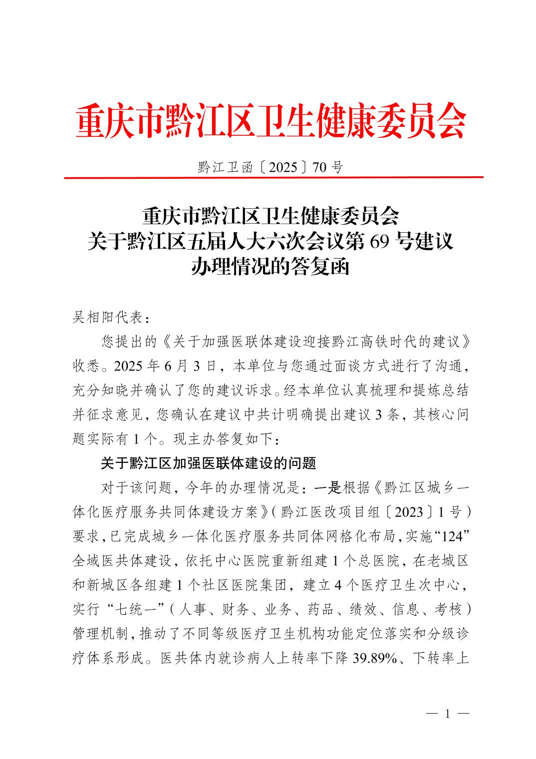 重慶市黔江區衛生健康委員會關于黔江區五屆人大六次會議第69號建議辦理情況的答復函