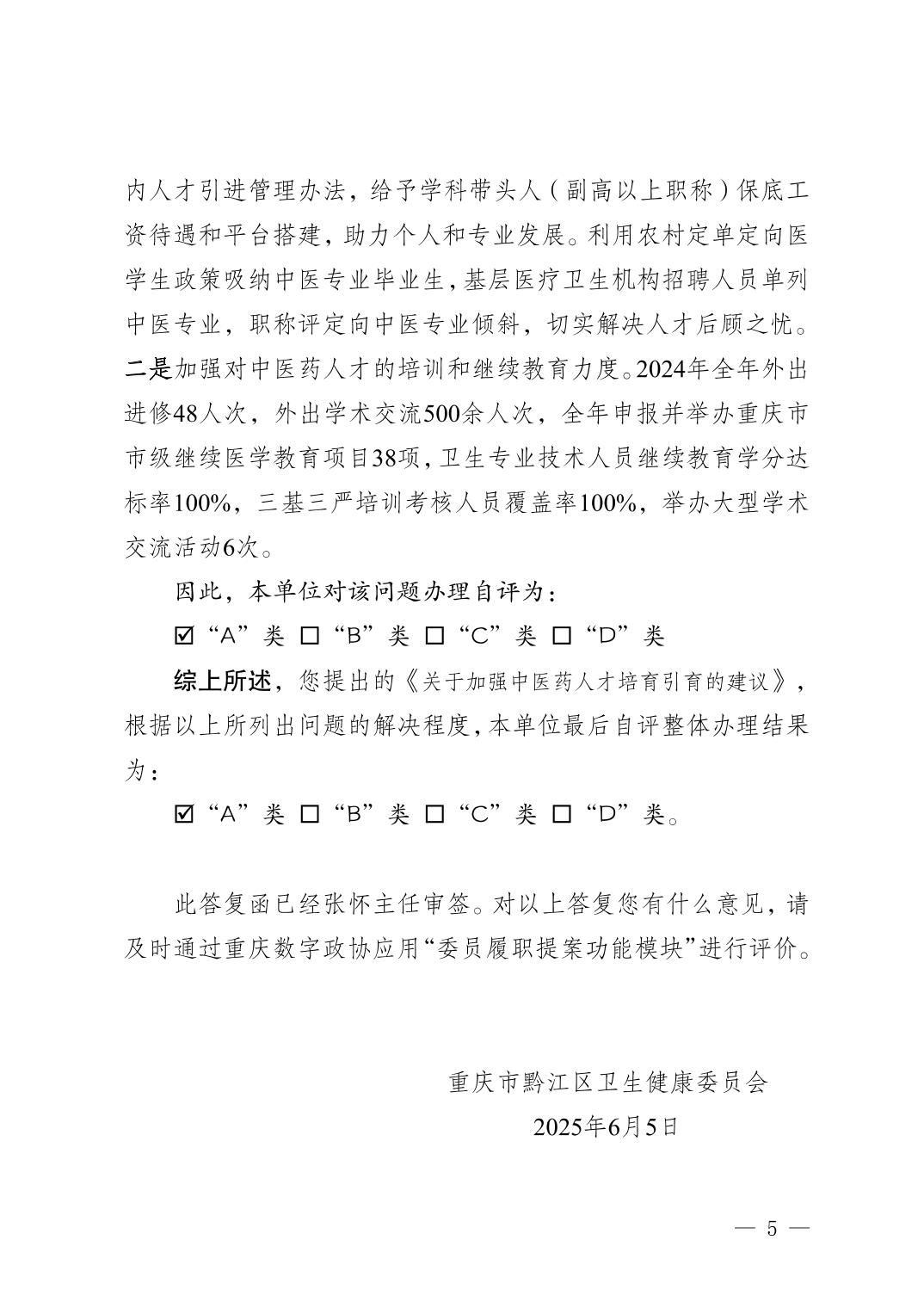 重慶市黔江區衛生健康委員會關于黔江區政協五屆四次會議提案第169號辦理情況的答復函
