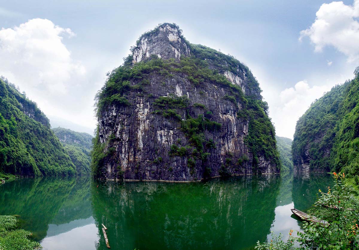 神龜峽位于阿蓬江下游,是國家4A級旅游景區,因峽口兩山酷似雌雄雙龜對臥而得名。兩岸高山絕壁,河道斗折蛇行,形成了天門、巨佛、三郎峰、石壁畫廊、薄刀嶺等奇特景觀,盡顯自然的鬼斧神工。沿途絕壁夾江,全程有27個彎,有神門、天門、人門等28個門,其彎道之多,實屬峽谷罕見。峽谷兩岸茂林修竹,植被原始古樸,生態優美。兩岸不時有飛瀑奔瀉而下,情趣飄逸。富顯詩情畫意,是舞文的書齋,揮毫的畫卷,科考的著床。